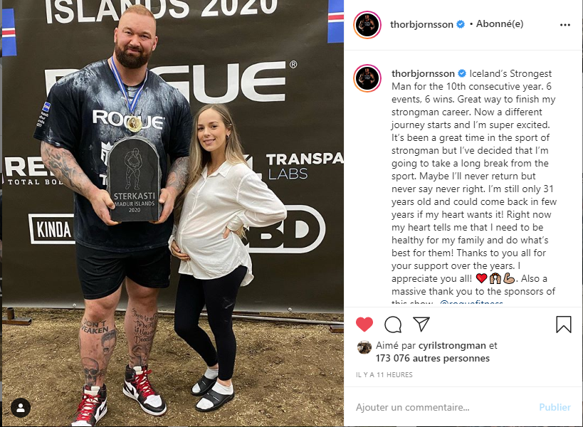 La taille du mec par rapport à sa femme (même enceinte)Voilà, petit message de Thor après sa victoire habituelle des Iceland's Strongman